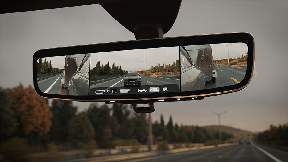 Der ClearView™-Außenspiegel integriert eine Kamera in einen herkömmlichen Spiegel, der den gesetzlichen Vorschriften entspricht. Mit einem größeren Sichtfeld, intuitiven dynamischen Overlays, reduziertem Luftwiderstand und verbesserter Sichtbarkeit bei schlechten Lichtverhältnissen zeigen die Systeme einen Live-Feed der Kamera auf einem in die A-Säule integrierten Bildschirm an.